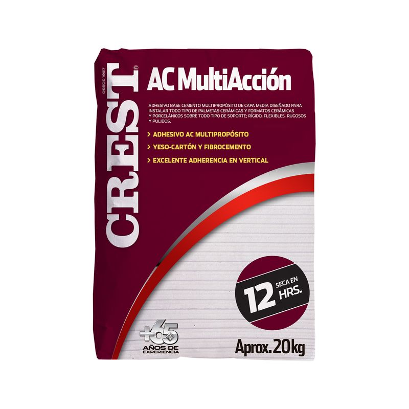 CREST MultiAction® es un adhesivo base cemento de capa gruesa de 3 mm a 20 mm de espesor, diseñado para la instalación de palmetas porcelánicas, gresificadas, cerámicas y piedras naturales de alta, media, baja y nula absorción de agua en formatos grandes de hasta 160 cm. Ideal para soportes rígidos como concreto o mortero poroso y pulido; también para soportes flexibles de tipo paneles de tabla cemento y tabla yeso, en interiores y exteriores. Este adhesivo ofrece una baja emisión de polvo y es adecuado para pisos y muros con tráfico residencial y comercial. Gracias a su fraguado rápido, es también efectivo para instalar piso sobre piso en interiores.